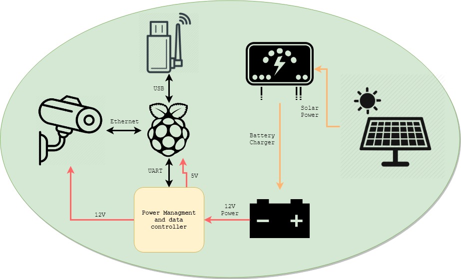 The “Power Management and data controller” from my sketch is an abstraction of the electronics that will be used to create a proper power interface for the devices like Raspberry Pi and IP cameras, or other 5V and 12V devices. Also this will be used to pass useful information to the higher layer, for example the battery voltage or the commands that will disable or enable the 5V and 12V outputs.