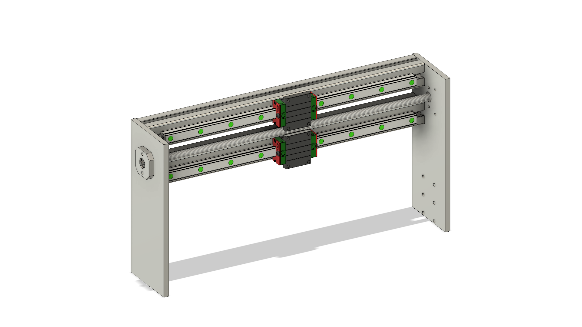 In prima versiune (prima imgine) a proiectului am dorit sa folosim pentru axa X ghidaje cu ax rotund cu un diametru de 16-20 mm care sa asigure pe langa miscarea axei X si legatura celor doua placi laterale, astfel reducand cantitatea de material, dar si complexitatea prelucrari acestuia (taiere, gaurire, etc). Problema pe care am identificat-o dupa prezentarea acestei solutii unui mester strungar a fost ca spre deosebire de usurinta prin care poti modela o gaura si un filet interior in Fusion 360, in lumea reala ar fi foarte dificil de realizat, tinand cont ca aceste axe rotunde sunt din otel calit si sunt foarte greu prelucrabile.